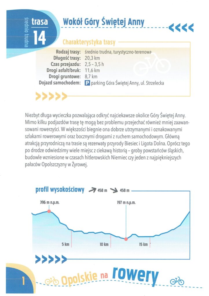 Korzystając z przewodnika “Opolskie na rowery” pragniemy zachęcić do niezbyt długiej wycieczki pozwalającej odkryć najciekawsze okolice Góry Świętej Anny.